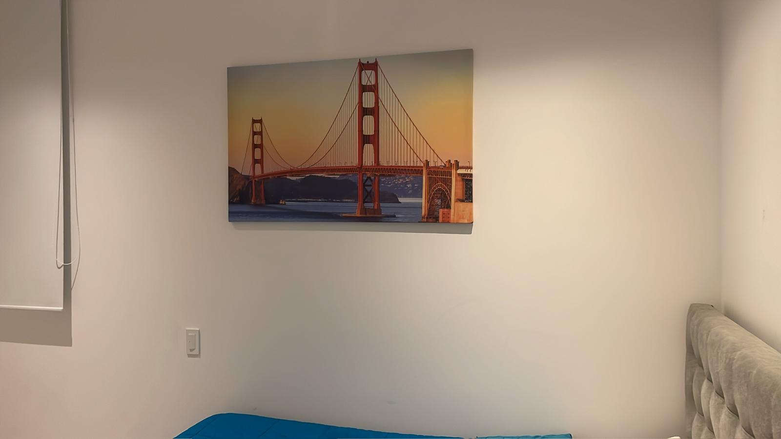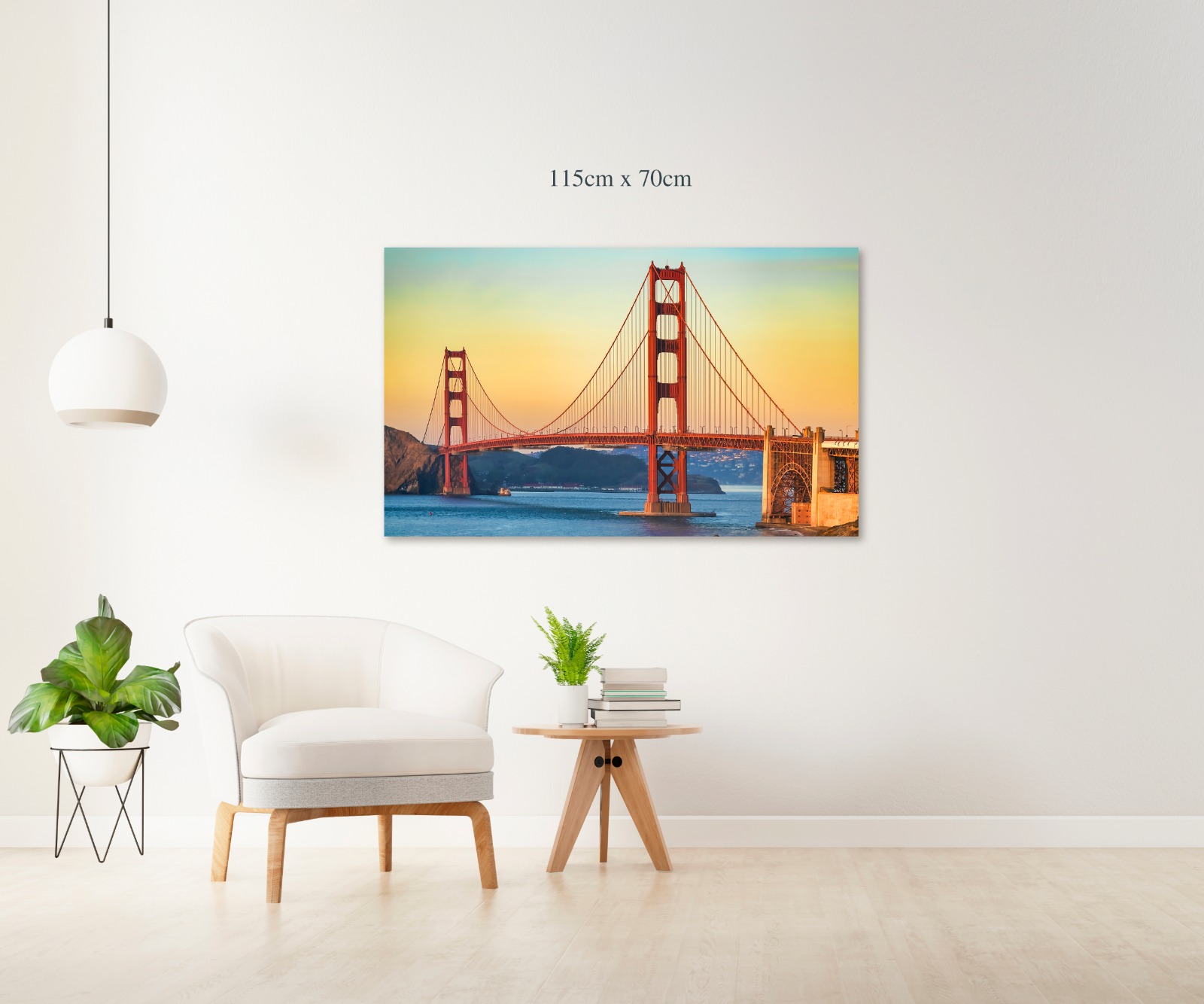 Captura la esencia de la arquitectura clásica y la calidez de la hora dorada con esta impresionante vista del puente Golden Gate. Esta pieza no es solo una fotografía; es una ventana a la serenidad de la bahía de San Francisco, diseñada para convertirse en el punto focal de cualquier espacio moderno.