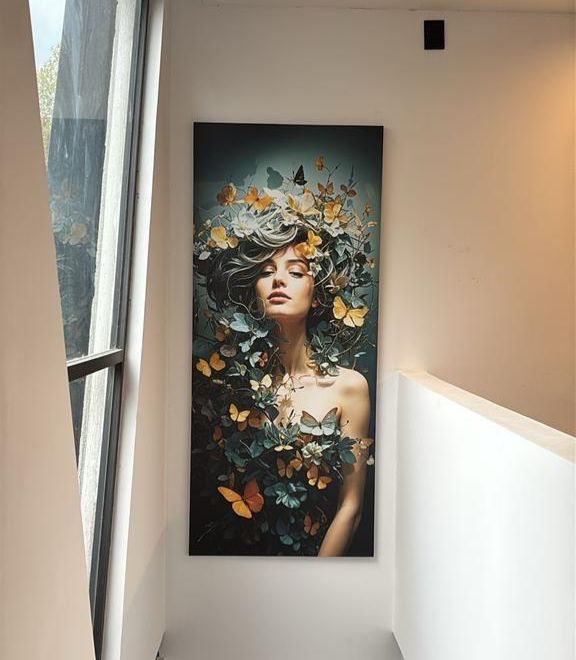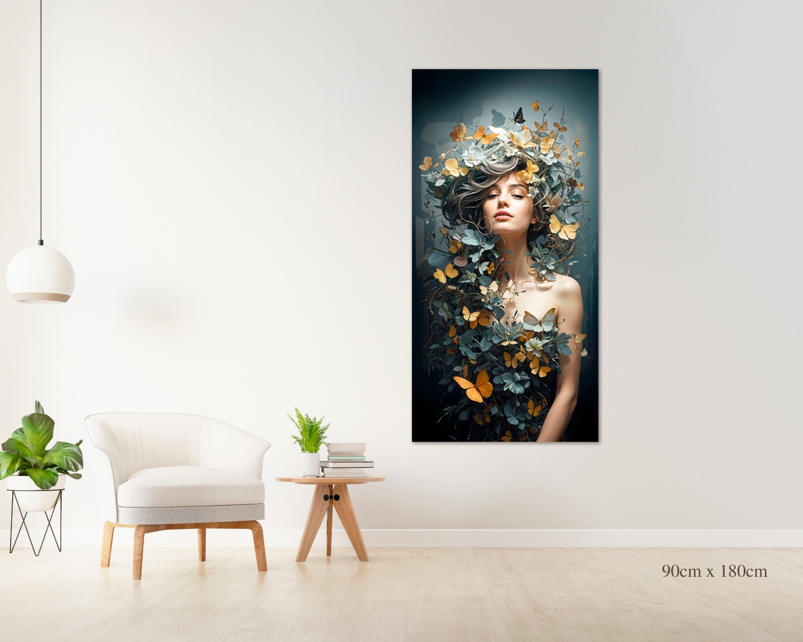 Sumérjase en un mundo de ensueño con este retrato cautivador que celebra la conexión mística entre la feminidad y la naturaleza. «Ninfa de las Monarcas» presenta a una figura etérea envuelta en una corona de flores silvestres y mariposas monarca que parecen cobrar vida. Con un contraste magistral entre el fondo profundo y los tonos ámbar vibrantes, esta pieza es ideal para crear un punto focal de serenidad, elegancia y fantasía en dormitorios, salas de estar o espacios creativos.