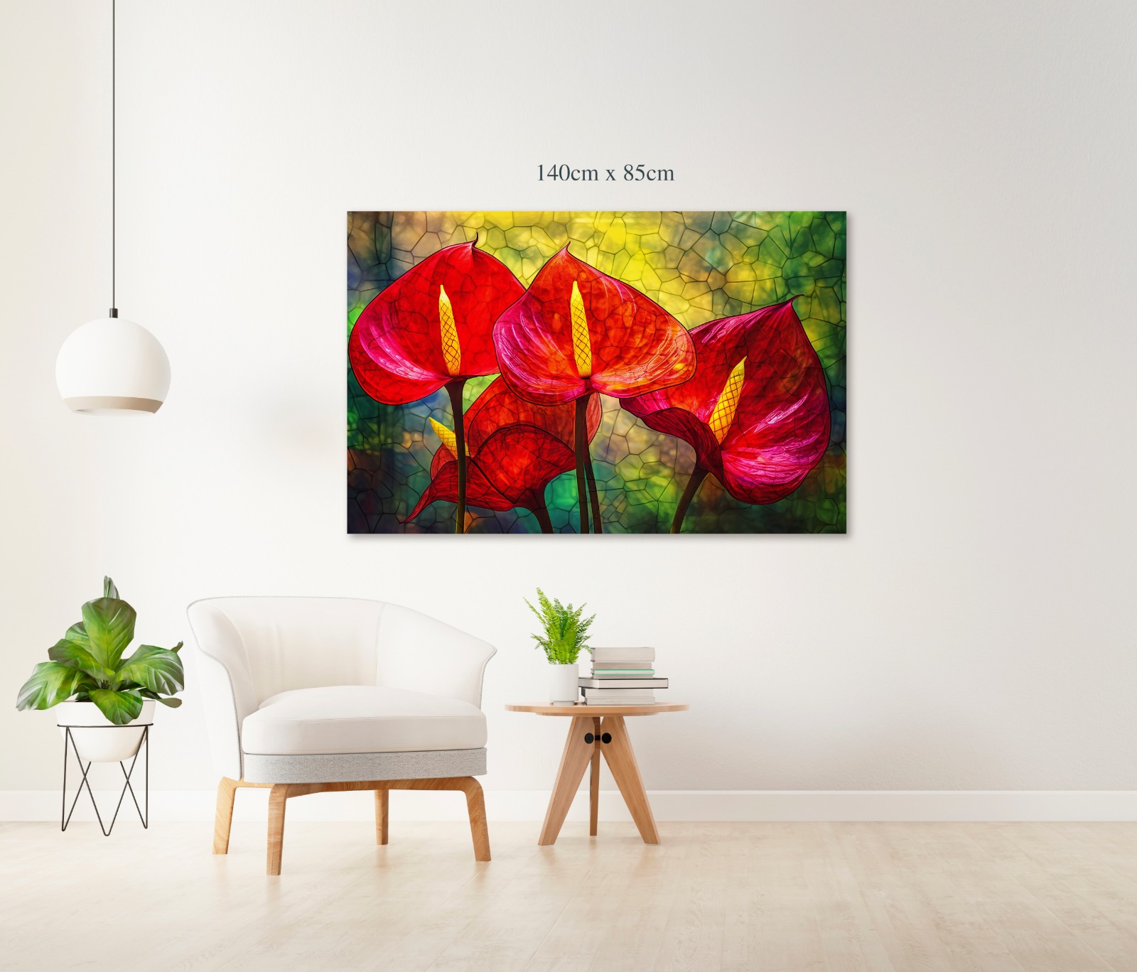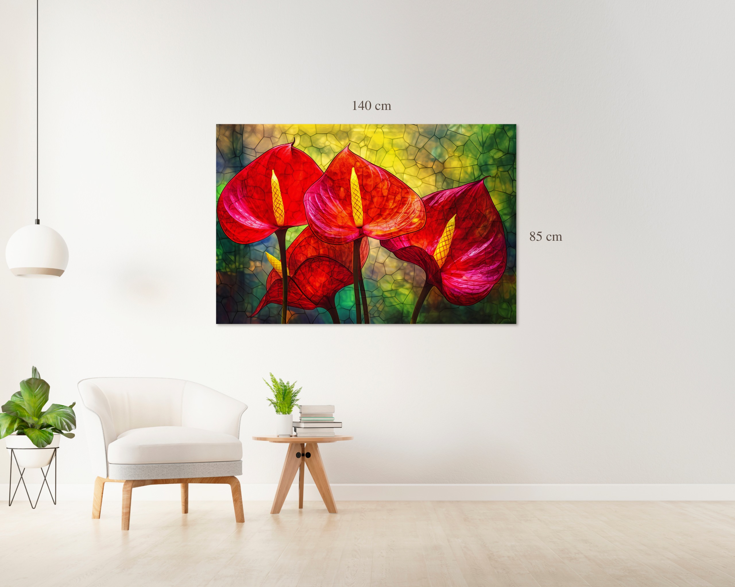 Eleva la energía de tu hogar con esta pieza maestra que fusiona la belleza orgánica de la naturaleza con la geometría del arte en vitral. Los tonos rojos profundos de los anturios simbolizan hospitalidad y pasión, mientras que el fondo texturizado crea un juego de luces y sombras que añade profundidad tridimensional a cualquier habitación.